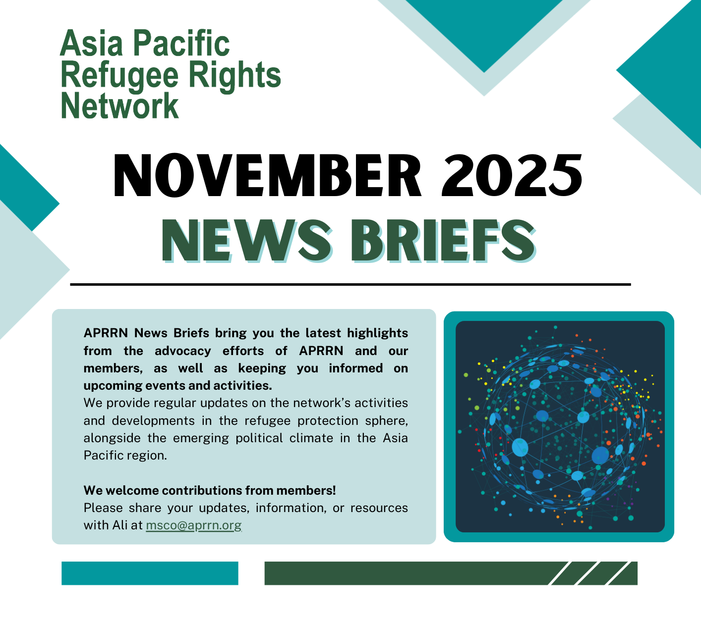 Monthly Newsletter (November 2025) Our News Briefs bring you the latest highlights from the advocacy efforts of APRRN and our members, as well as keeping you informed on upcoming events and activities. We strive to provide regular updates on the network’s activities and developments in the refugee protection sphere, alongside the emerging political climate in the Asia Pacific region.